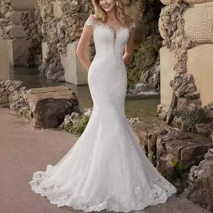 Gaun pernikahan lengan pendek wanita, baru renda pengantin ramping kerah V dalam perspektif ekor cahaya meliputi lengan elegan slim-fit 2024