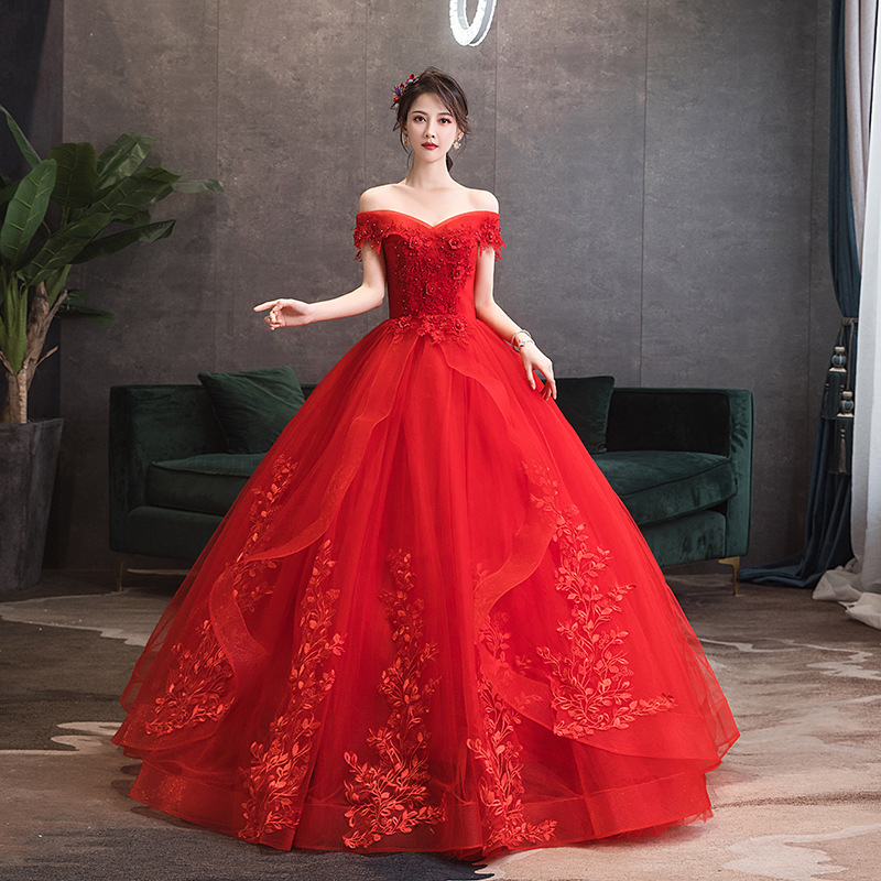 Gaun pernikahan bahu terbuka 2024 gaun pengantin baru musim semi dan musim panas rok pettiskirt pelangsing Panjang menyentuh lantai gaun pernikahan utama merah selebriti Internet