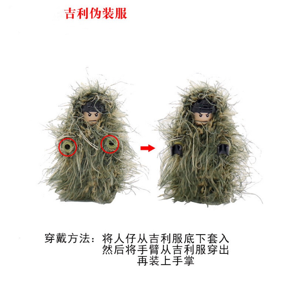 Pakaian boneka lintas batas mainan blok bangunan aksesori pakaian kamuflase bersenjata pakaian Gilly wol buatan tangan salju rumput