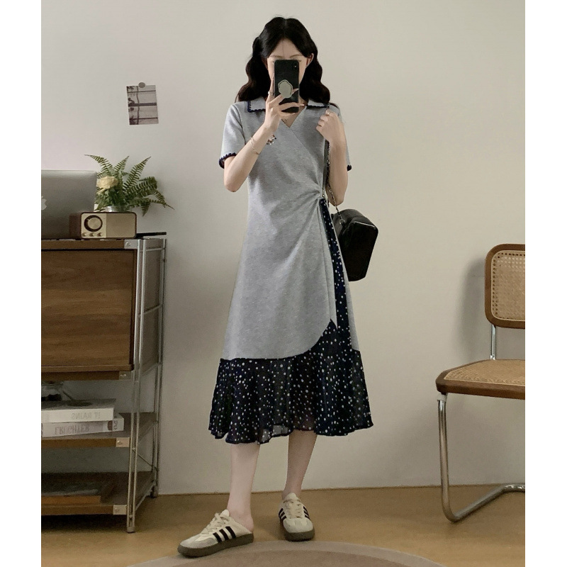 Gaun Kombinasi Polka Dot Ukuran Besar Musim Panas Tahun 2025 Rok T-Shirt Wanita Musim Panas Ukuran Besar Model Panjang Sedang Kerah V Terlihat Langsing Membentuk Pinggang Kancing Kancing