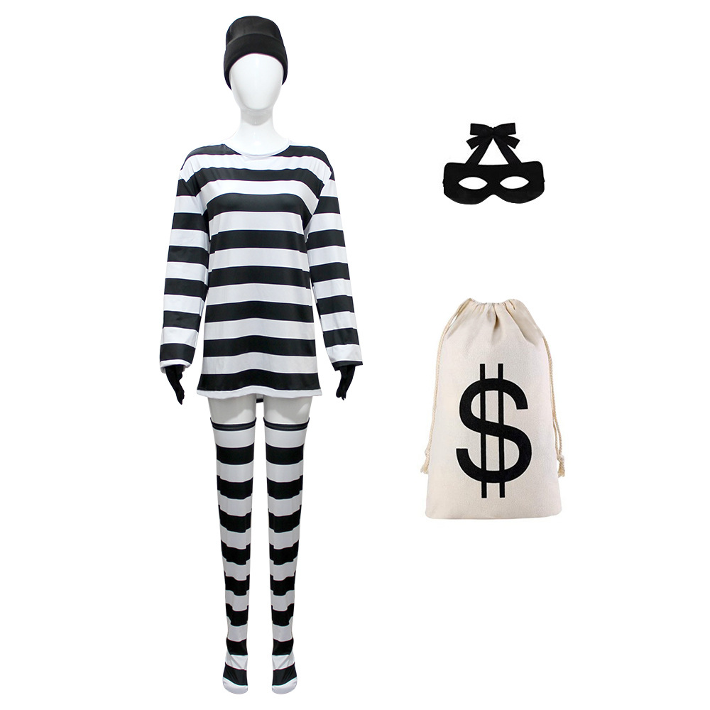 Festival pesta masquerade wanita pencuri tahanan Masker Mata topi rajut Sarung tangan stoking bergaris kanvas tas uang berdandan