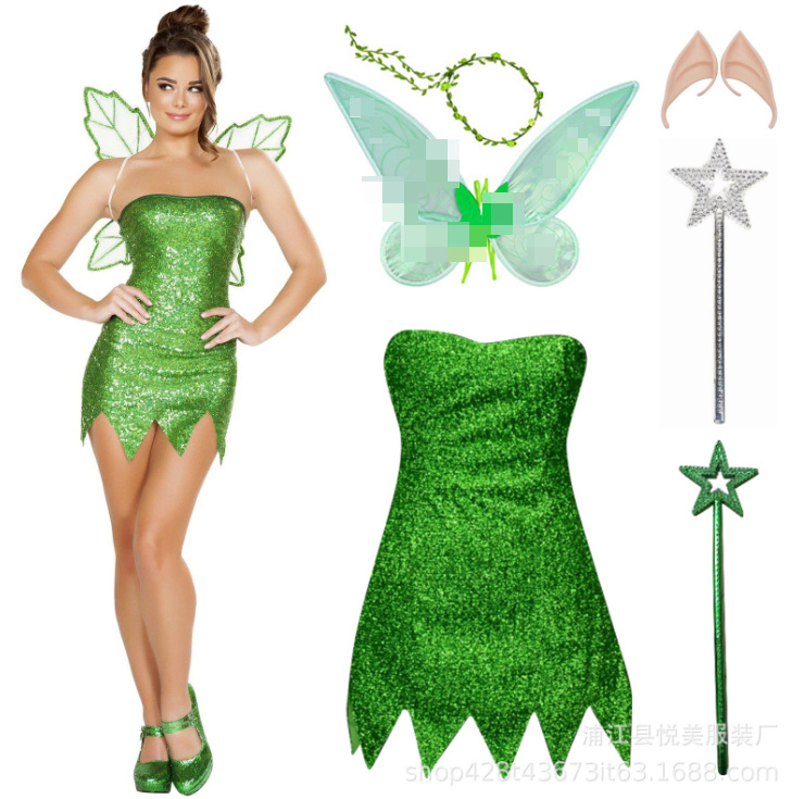 Kostum cos Halloween, kostum cosplay peri, gaun hijau bel Tinker indah