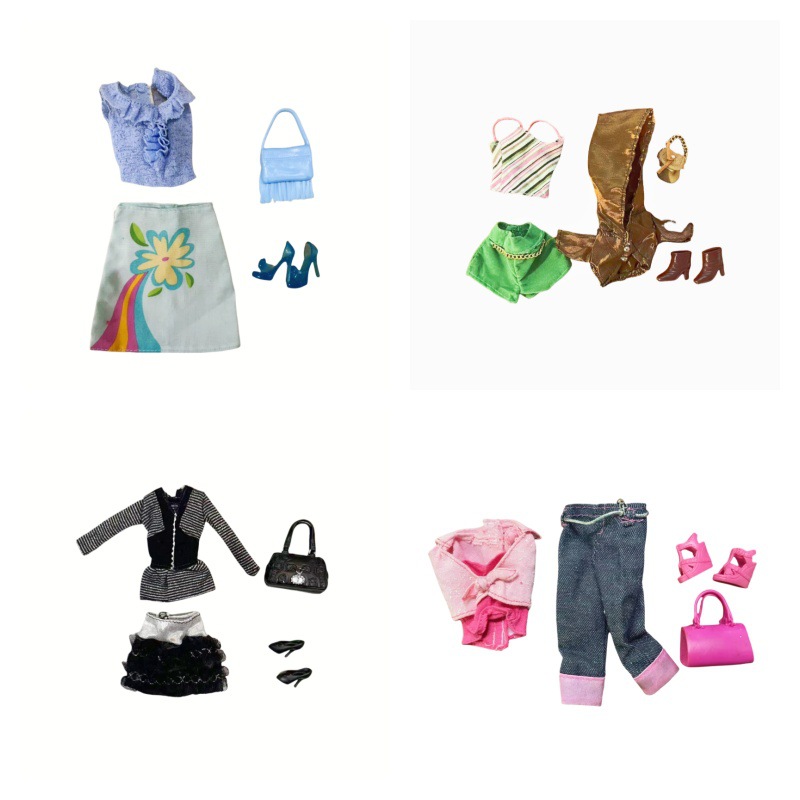 Set pakaian boneka enam potong bergaya gadis seksi dengan sepatu, tas, aksesoris, potongan unik, fashion gaya jalanan, kualitas ekspor.
