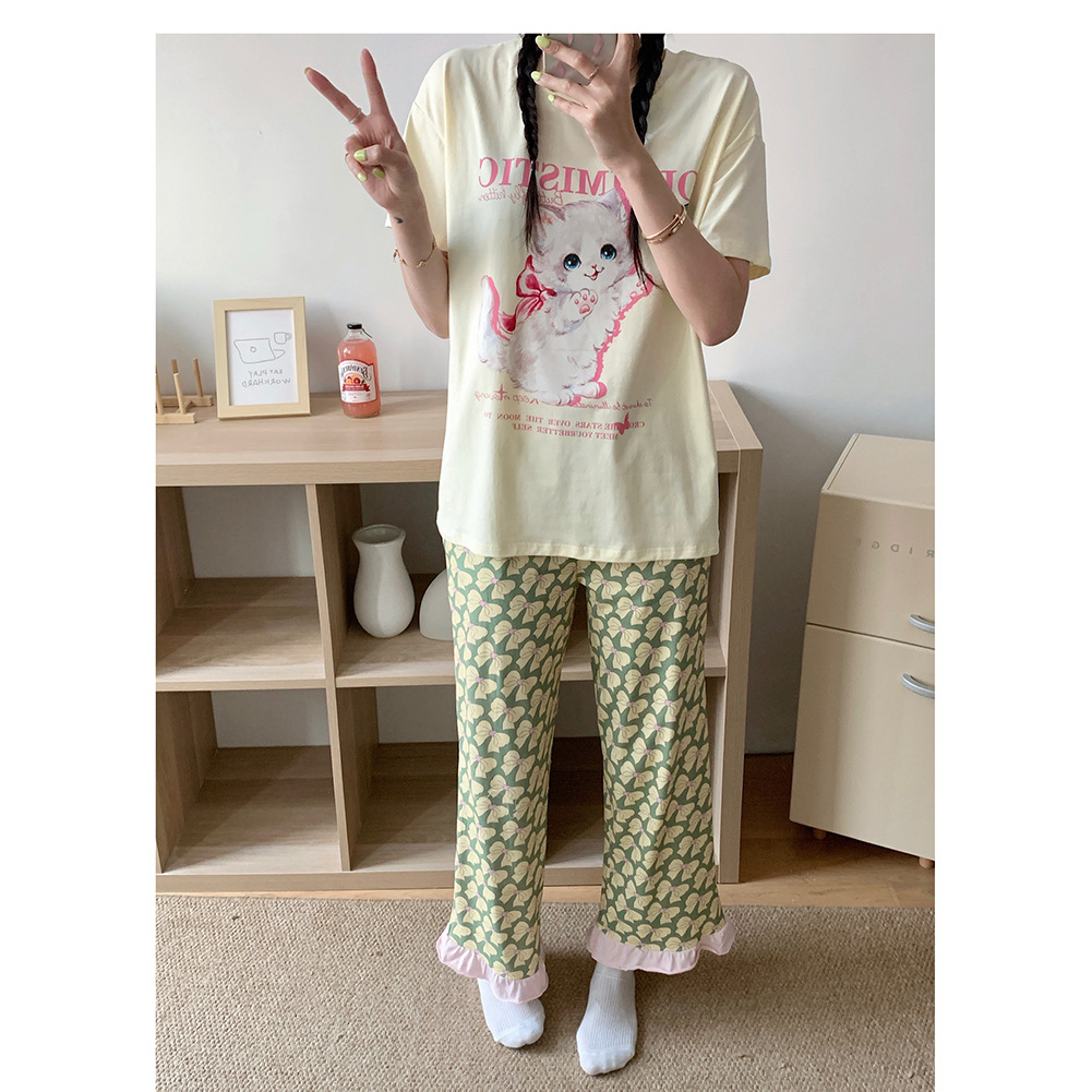 Setelan pakaian rumah celana panjang Motif penuh pita lengan pendek taman katun cetak motif kupu-kupu kucing