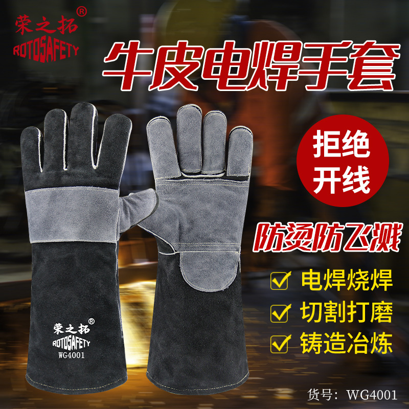 Sarung tangan las kulit sapi panjang 16 inci, sarung tangan las kawat tahan api lapisan ganda tebal menyerap keringat tahan aus