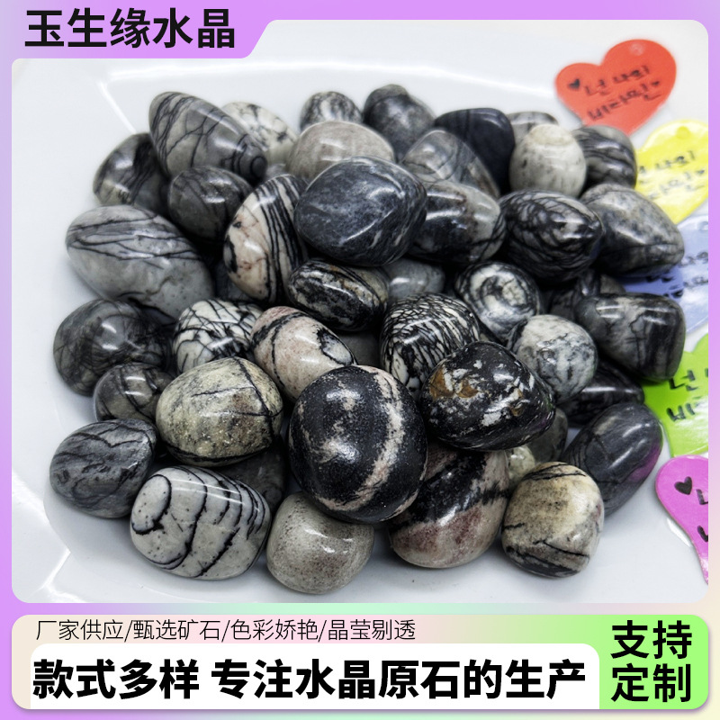 Pasokan pabrik alami ornamen pemolesan jaringan hitam jala hitam batu bergulir tangki ikan lanskap pot bunga dekorasi batu kristal