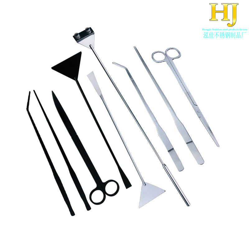 Klip tanaman air hitam dari baja tahan karat, pinset yang diperpanjang, pengikis alga, gunting lurus dan melengkung, sekop pasir datar, alat pembersih lansekap akuarium