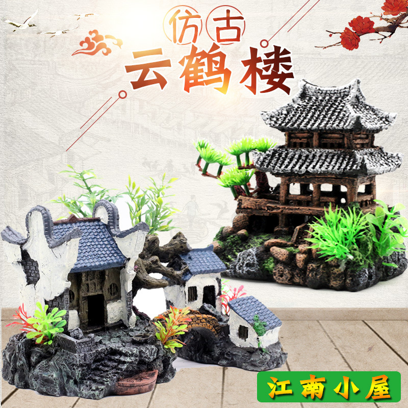 Paket pemandangan akuarium batu karang tangki ikan, dekorasi bangunan kota air Jiangnan pondok
