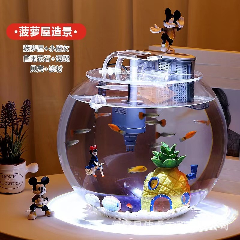 Tangki ikan kaca super putih, baru kecil rumah tangga ruang tamu bebas air ekologis bulat malas pemandangan ikan Dekorasi