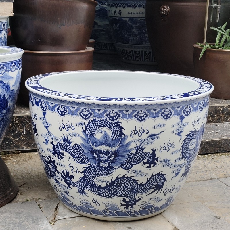 Jingdezhen tangki air keramik, pot bunga tanaman pohon besi dekorasi taman tangki ikan porselen biru dan putih pola naga dicat tangan besar