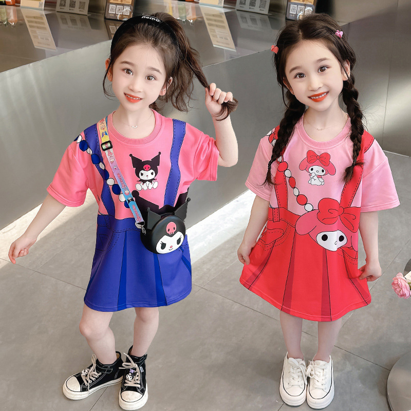 T-shirt anak perempuan musim panas lengan pendek rok T-shirt anak-anak panjang setengah lengan musim panas T-shirt rok anak perempuan dua potong palsu gaya Barat