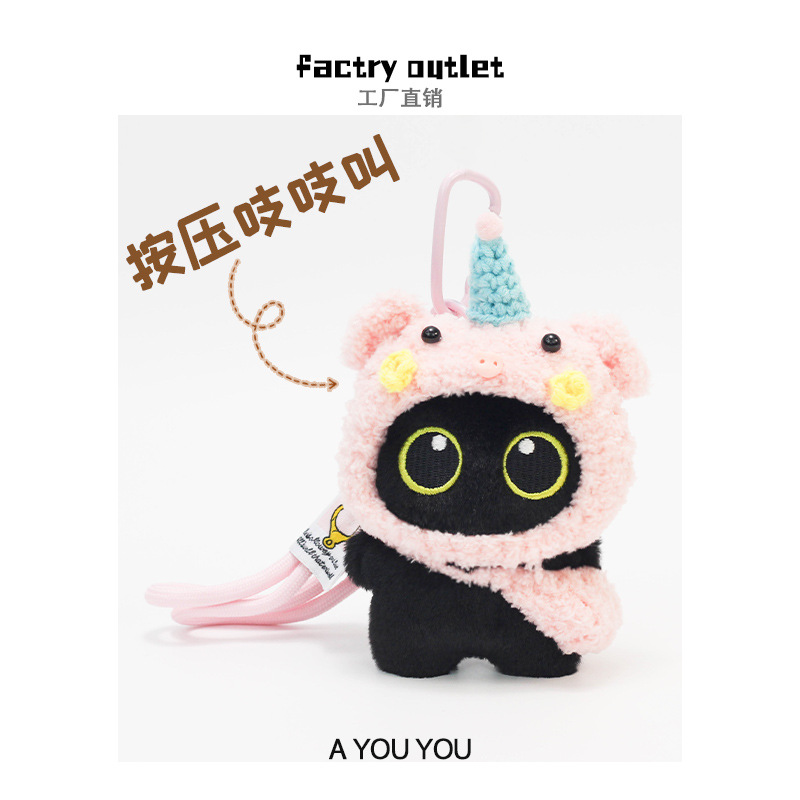 原创小猪头套大眼黑猫毛绒公仔吱吱叫猫咪书包挂件精致钥匙扣挂饰