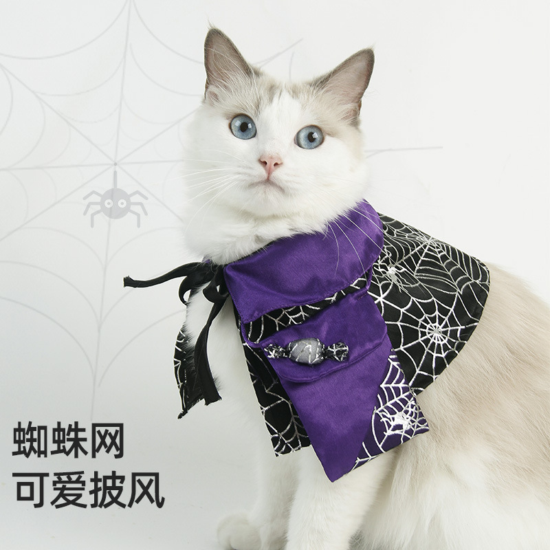 Chihuazi perhiasan hewan peliharaan Halloween jubah kucing anjing dekorasi liburan jubah jaring laba-laba dapat disesuaikan syal