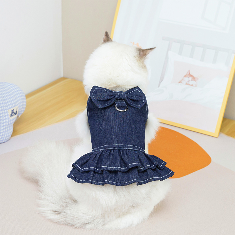 Setelan Denim dasi kupu-kupu besar kucing peliharaan mengadopsi traksi d-ring anak kucing anjing rok denim pakaian hewan peliharaan kaus