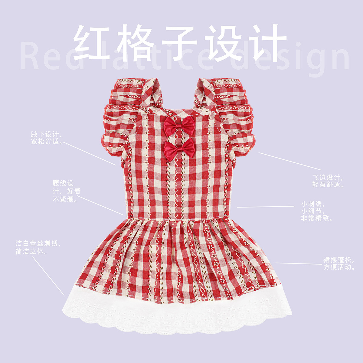 Gaun baru Amazon gaun pita lengan terbang kotak-kotak merah pakaian kucing lucu gaun putri hewan peliharaan anjing