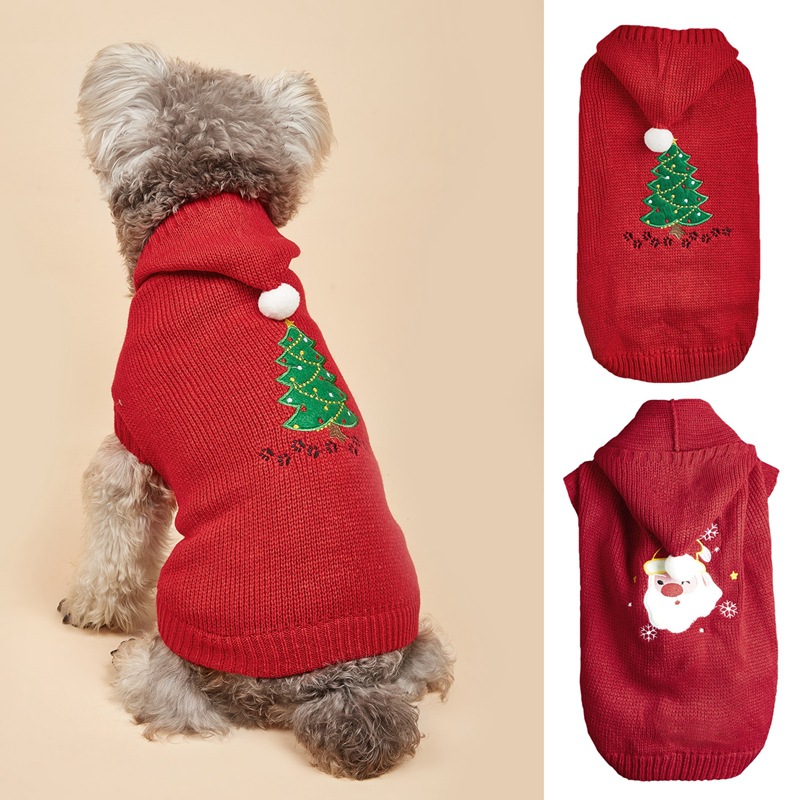 Liburan musim gugur dan musim dingin rajutan merah Santa Claus pohon Natal bola bulu putih berkerudung sedang dan kecil sweter anjing kucing