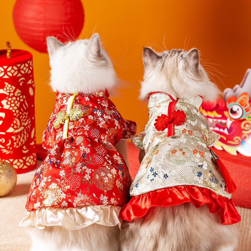 Kucing musim gugur dan musim dingin tahun baru seratus bunga rumbai Tang setelan rok Anjing Tahun Baru pakaian hewan peliharaan gaya istana Gaun