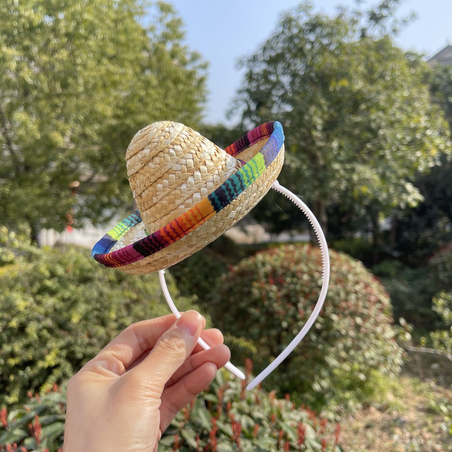 Topi jerami Meksiko Hawaii, aksesoris topi jerami Meksiko bando hiasan kepala topi hewan peliharaan model boneka topi jerami