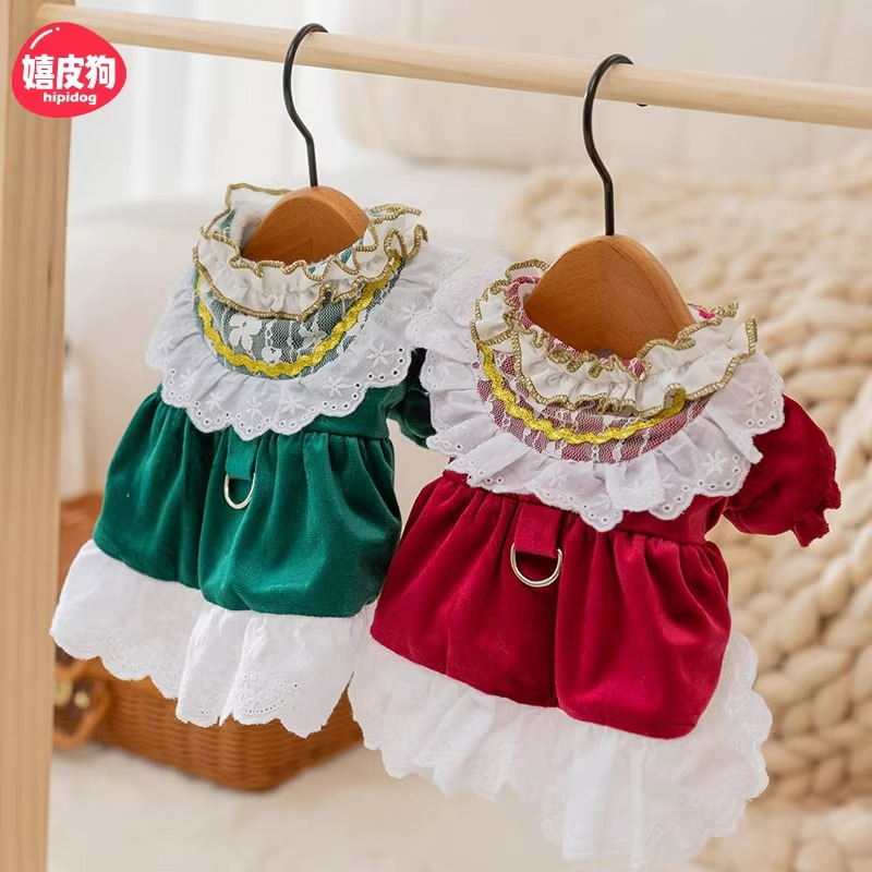 Gaun gaya putri kucing musim gugur dan musim dingin gaun renda beludru antiserat pakaian anjing peliharaan bantalan katun