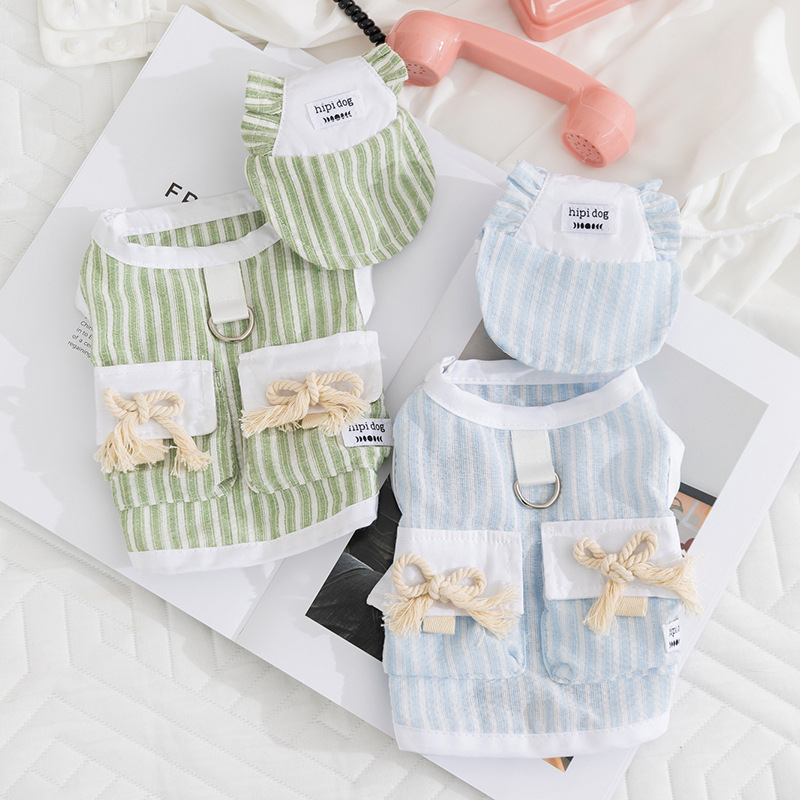 Musim Semi Musim Panas Sederhana Motif Garis Rajut Rompi Set Topi Anjing Kecil dan Menengah Kucing Teddy Pakaian Hewan Peliharaan