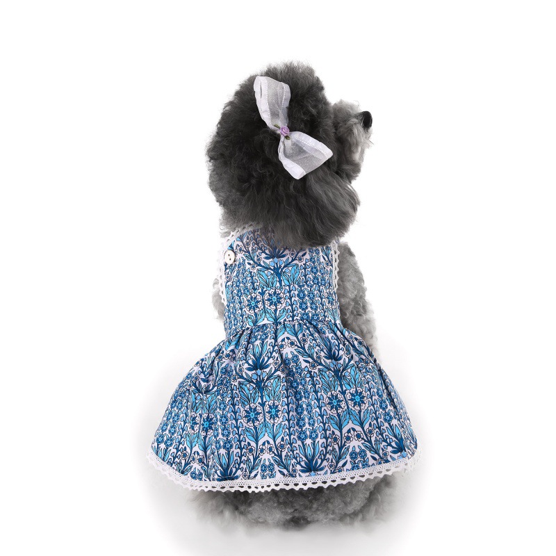 Musim Semi dan Musim Panas Hewan Peliharaan Anjing Kucing Biru dan Putih Porselen Bercetak Rok Pakaian Perlengkapan Hewan Peliharaan Teddy Bichon Pakaian Grosir