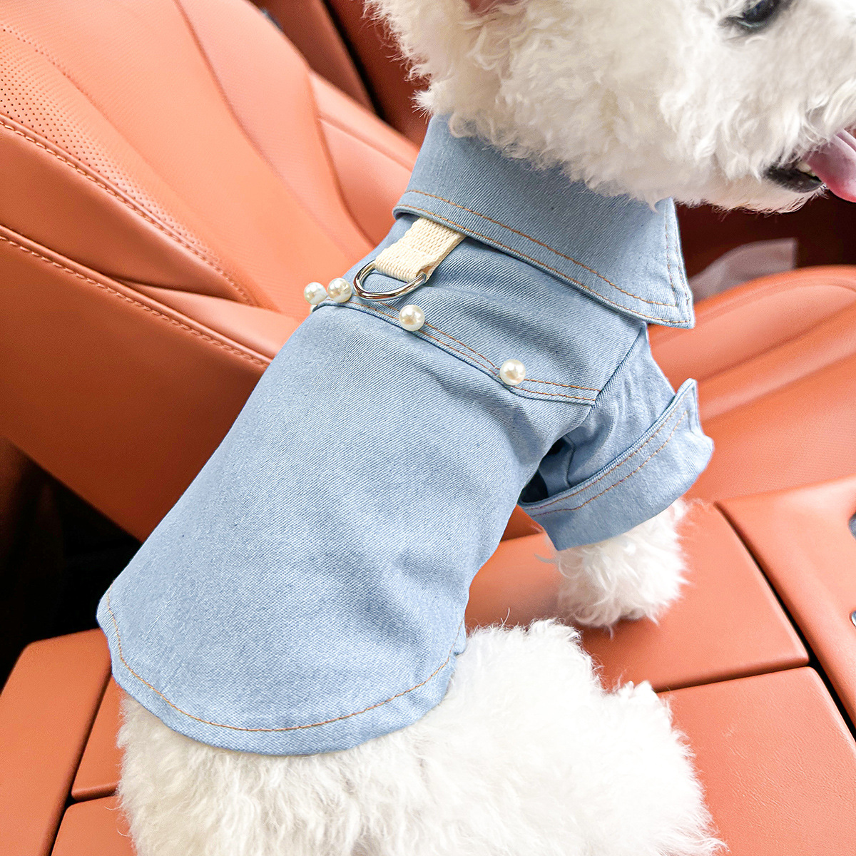 Barang Tersedia Bahan Puppy Hewan Peliharaan Bahan Puppy Pakaian Kucing Sumber Pabrik Pakaian Denim Kombinasi Kemeja Dalaman Punggung Mutiara