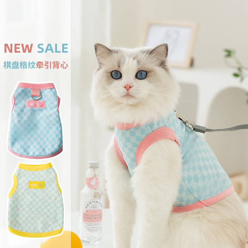 Sabuk kotak-kotak warna kontras, rompi traksi pakaian kucing, boneka kucing, emas secara bertahap lapisan, pakaian anak kucing susu kucing