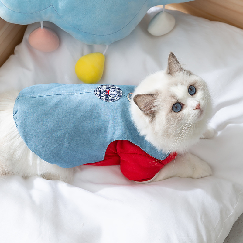Denim kaus traksi dua potong palsu pakaian kucing tipis musim panas boneka antiserat Inggris pendek cantik Musim Semi