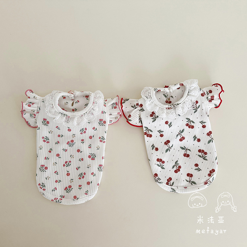 Pakaian Anjing Kucing Hewan Peliharaan Penjualan Langsung Pabrik Mifaya Baju Dalaman Lengan Terbang Renda Bunga Cherry Katun Murni Musim Semi Musim Gugur Musim Dingin