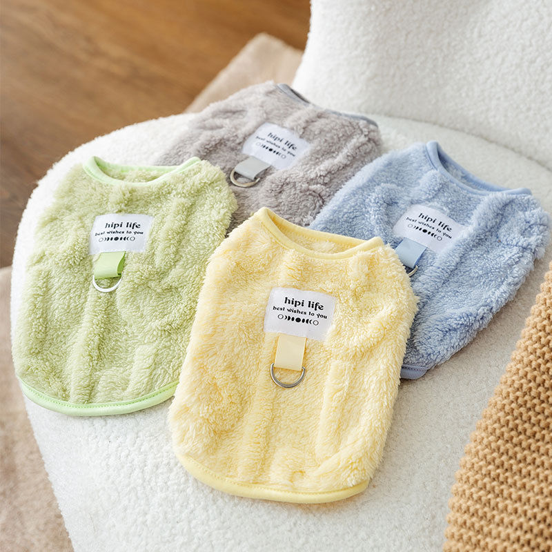 Tersedia sweter pullover bertudung sutra susu berlapis bulu musim gugur dan musim dingin pakaian anjing kucing dengan tali gesper cincin