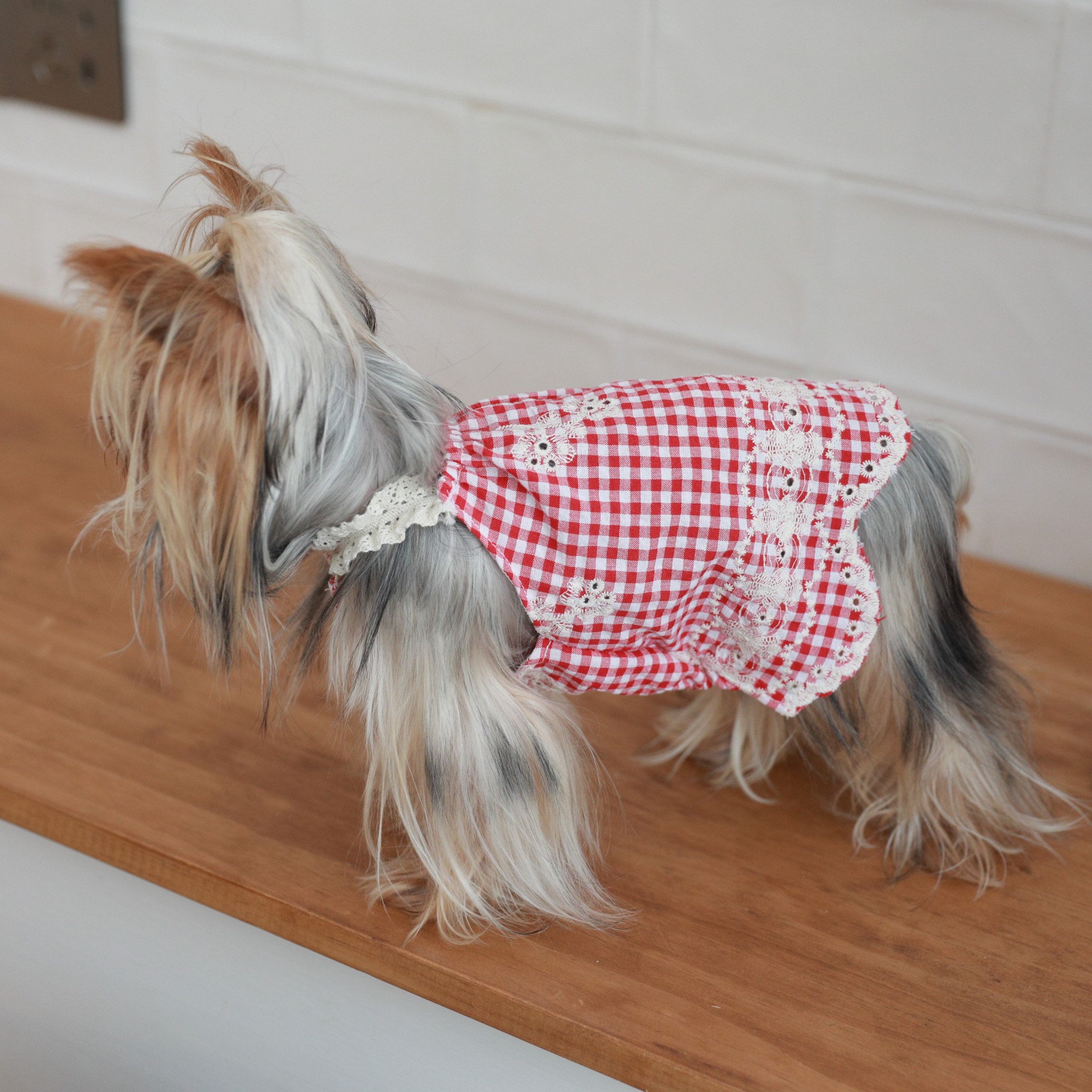 Pakaian Hewan Peliharaan Rok Suspender Kotak-Kotak Bordir Katun Murni Pakaian Kucing Kucing Yorkshire Sejuk Model Tipis Musim Panas