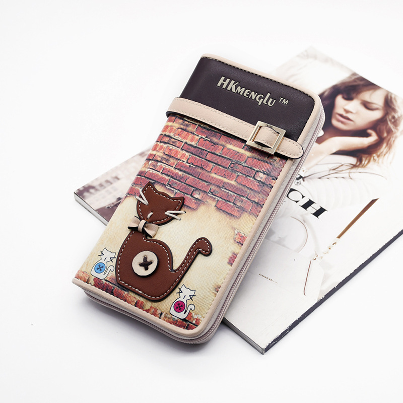 Dompet tangan panjang wanita, dompet ritsleting pu kucing kepribadian stiker kulit dekorasi sabuk perubahan ponsel