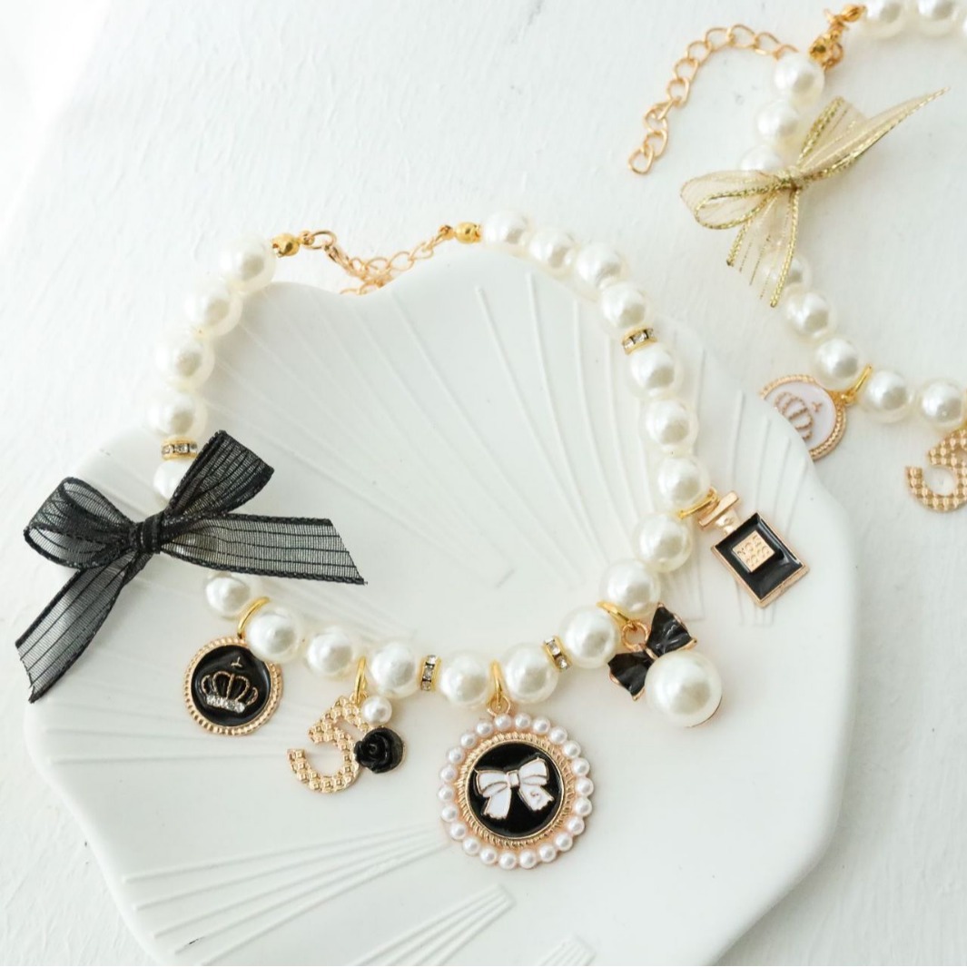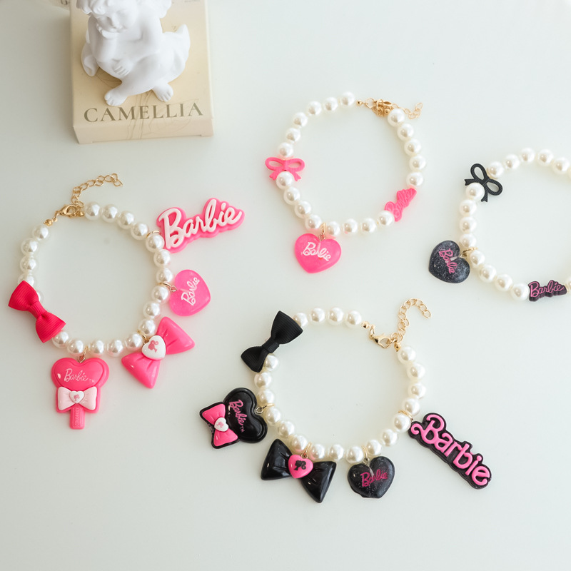 Kalung Mutiara Hewan Peliharaan Kalung Anjing Kucing Kecil Barbie Pita Kupu-Kupu Lucu Ornamen Hati Hitam Merah Muda