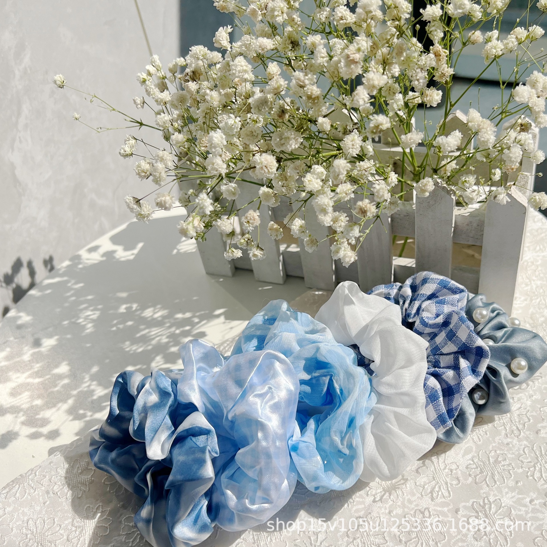 Pengiriman langsung pabrik cincin rambut usus besar seri biru cincin rambut Musim Semi segar aksesoris rambut kotak-kotak klasik cincin rambut manik-manik