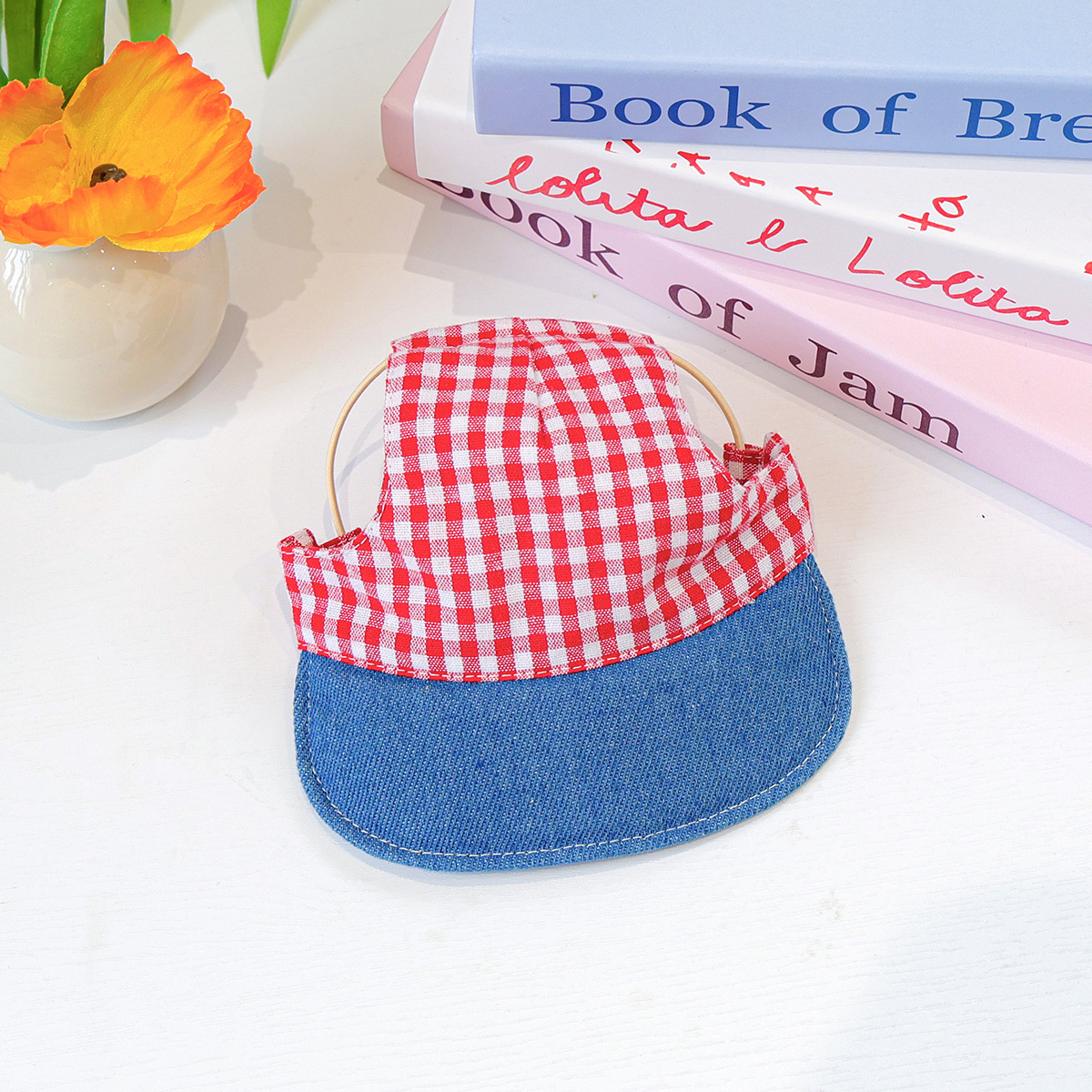 Topi Matahari Denim Kut Merah Aksesori Modis Kasual Lucu Teddy Bichon Anak Anjing Kucing Anjing Kecil