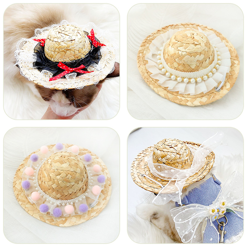 Topi jerami anjing penjualan khusus baru topi pita renda topi ulang tahun kucing topi matahari hewan peliharaan transformasi pakaian