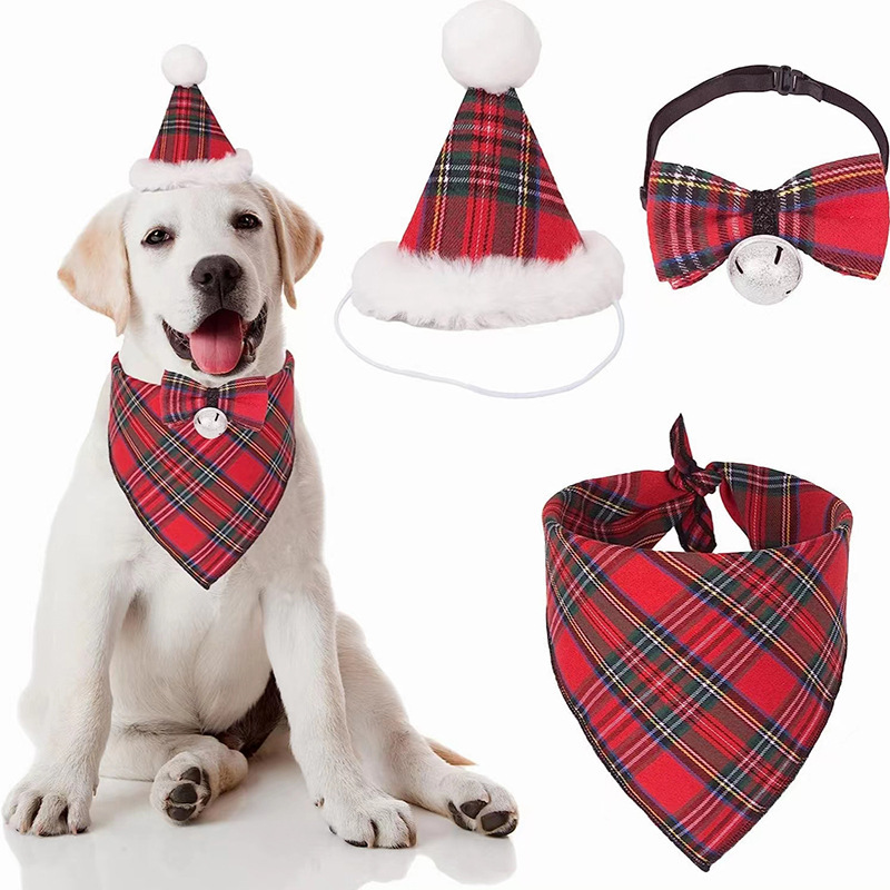 Topi perayaan pesta liburan hewan peliharaan, lintas batas handuk air liur bel kotak-kotak cantik dasi kupu-kupu perlengkapan dekorasi liburan Natal