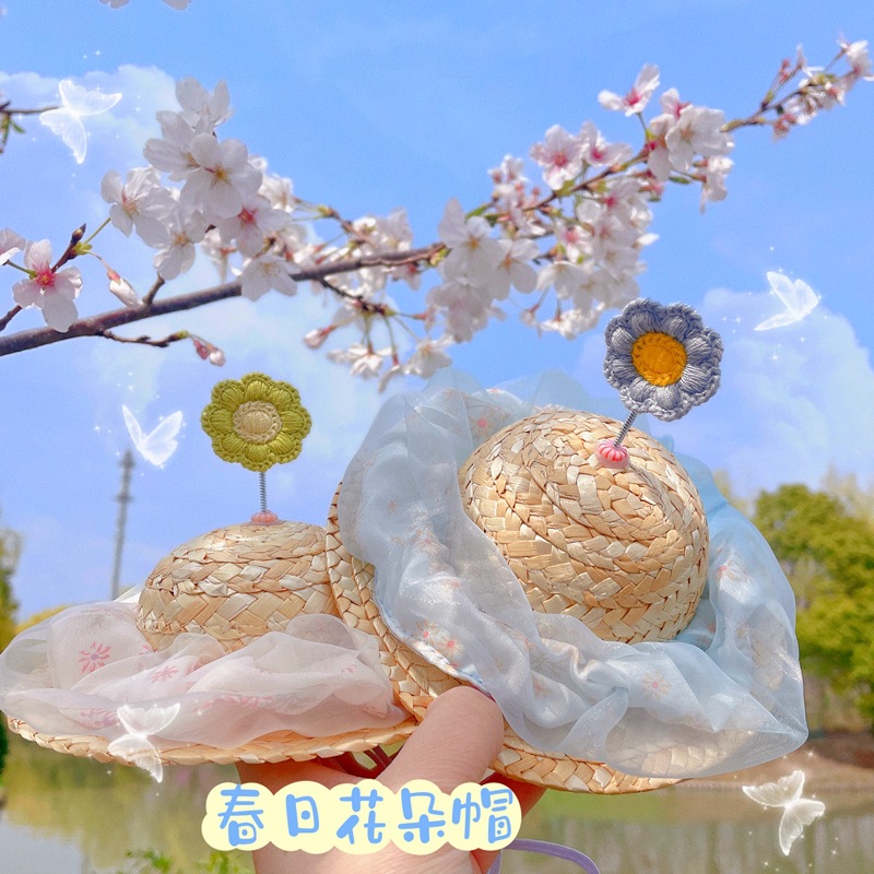 Topi bunga jaring hewan peliharaan terbatas musim semi topi jerami tahan matahari wanita ukuran besar properti foto hadiah ulang tahun kucing dan anjing