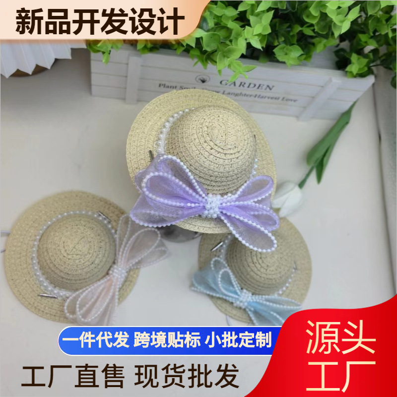 Topi Jerami Wanita Kucing Hewan Peliharaan Topi Jerami Mutiara Pita Kupu-Kupu Tenun Menutupi Matahari Kelinci Anjing Fotografi Outbound Aksesoris Kepala