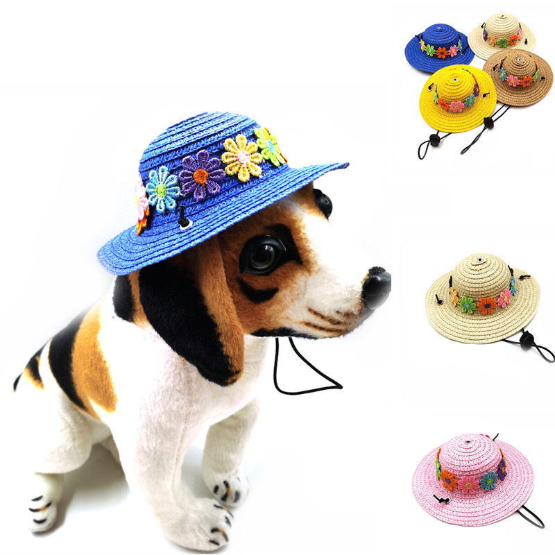 Topi jerami hewan peliharaan, topi anjing kepribadian, topi matahari bunga tujuh warna lucu putri kucing musim panas