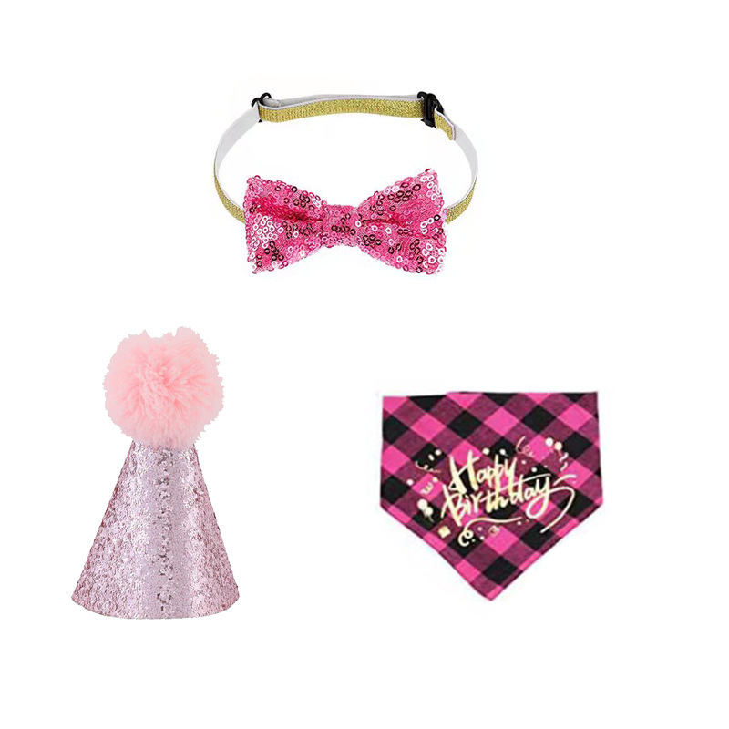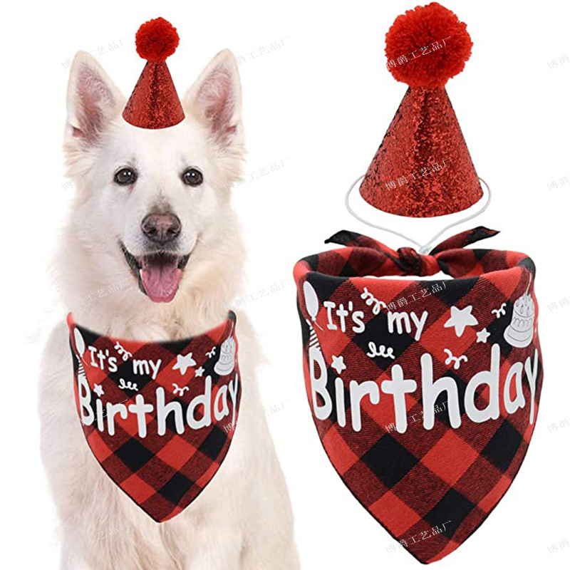 Set Ulang Tahun Hewan Peliharaan Kucing Anjing Dress Up Syal Topi Kotak-kotak Tepi Renda Handuk Air Mulut Set Ulang Tahun Hewan Peliharaan