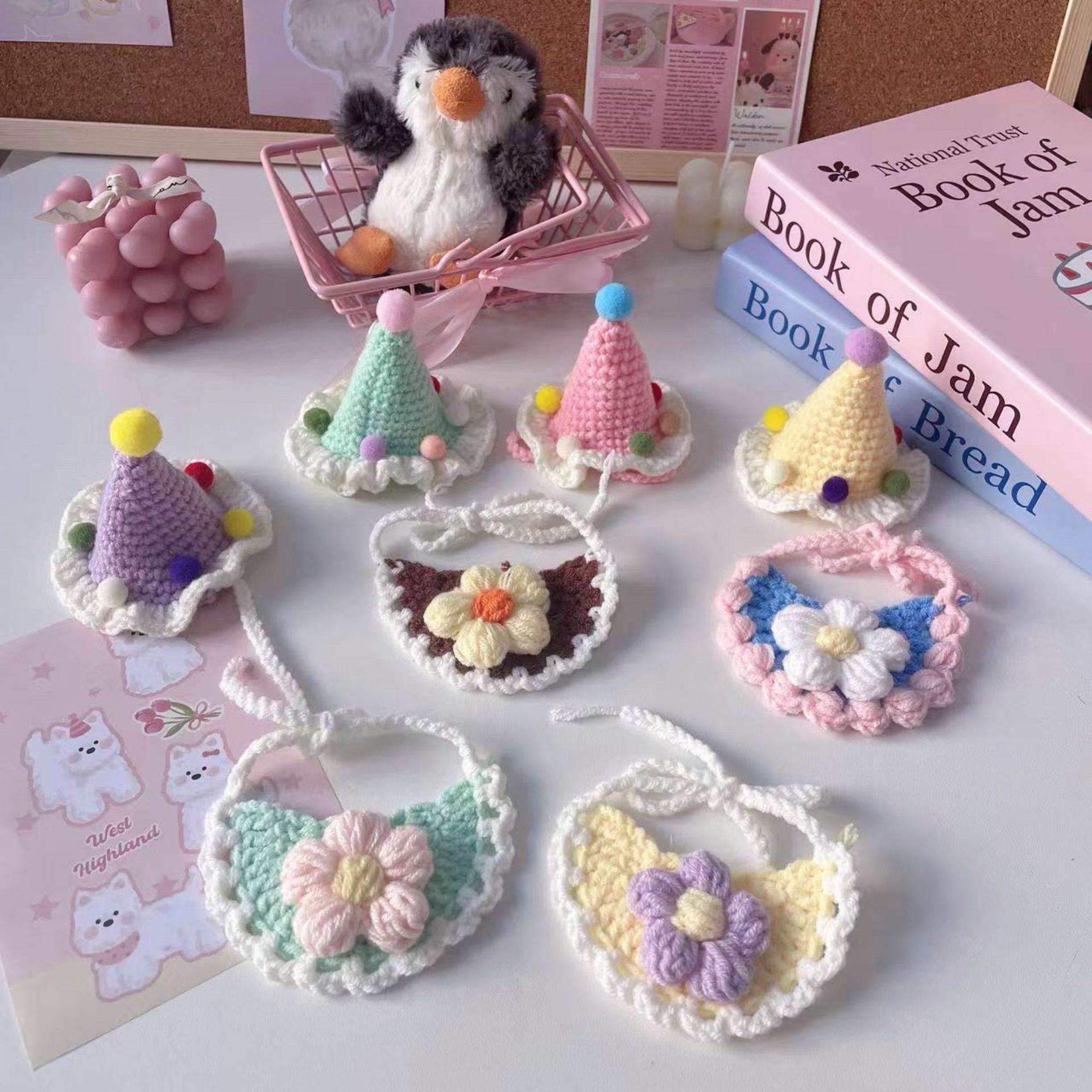Topi Warna Krim Hewan Peliharaan Anak Anjing Kucing Puff Bunga Set Bib Boneka Berganti Bib Produsen Grosir