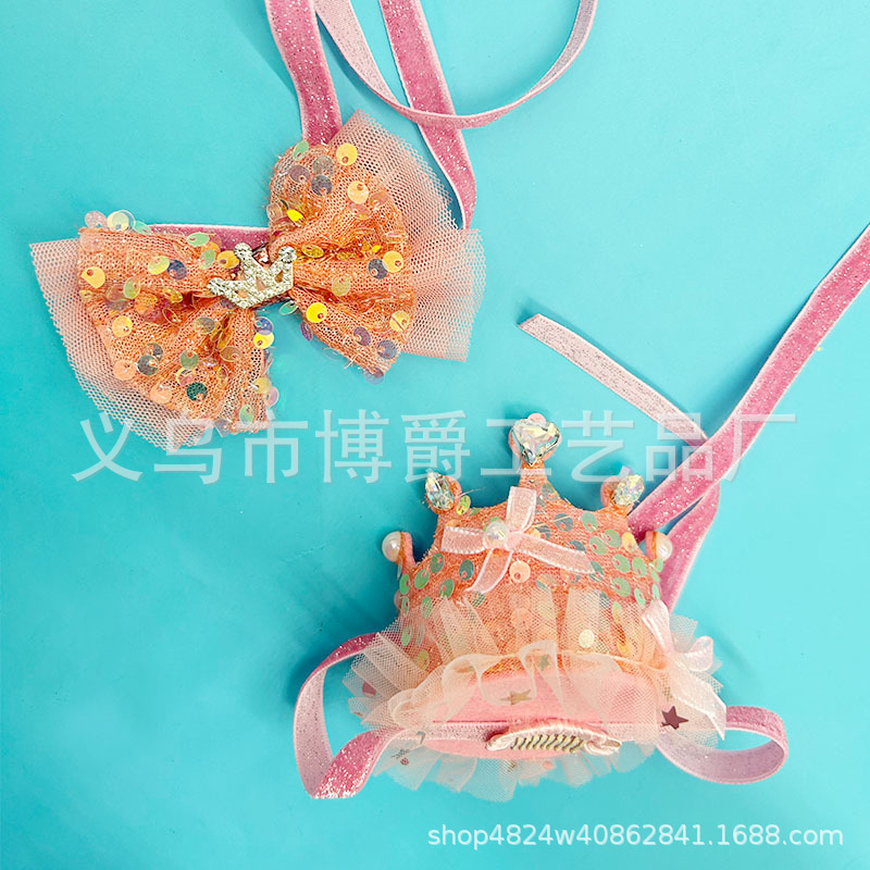 Setelan dekorasi anak, topi mahkota payet gaya putri, mutiara, renda, dasi kupu-kupu, kucing dan anjing lucu