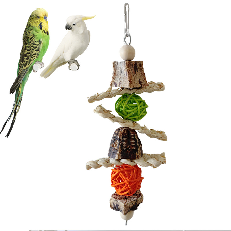 Mainan Gigit burung bayan mainan burung tali rami manik-manik berwarna benang gigitan blok kayu