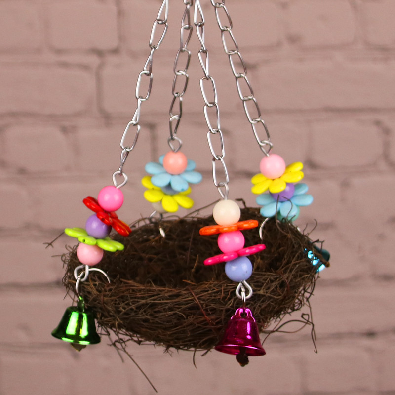Burung beo kecil mainan hewan peliharaan rotan sarang burung gigitan ayunan berdiri kandang burung aksesoris keranjang gantung sarang rumput