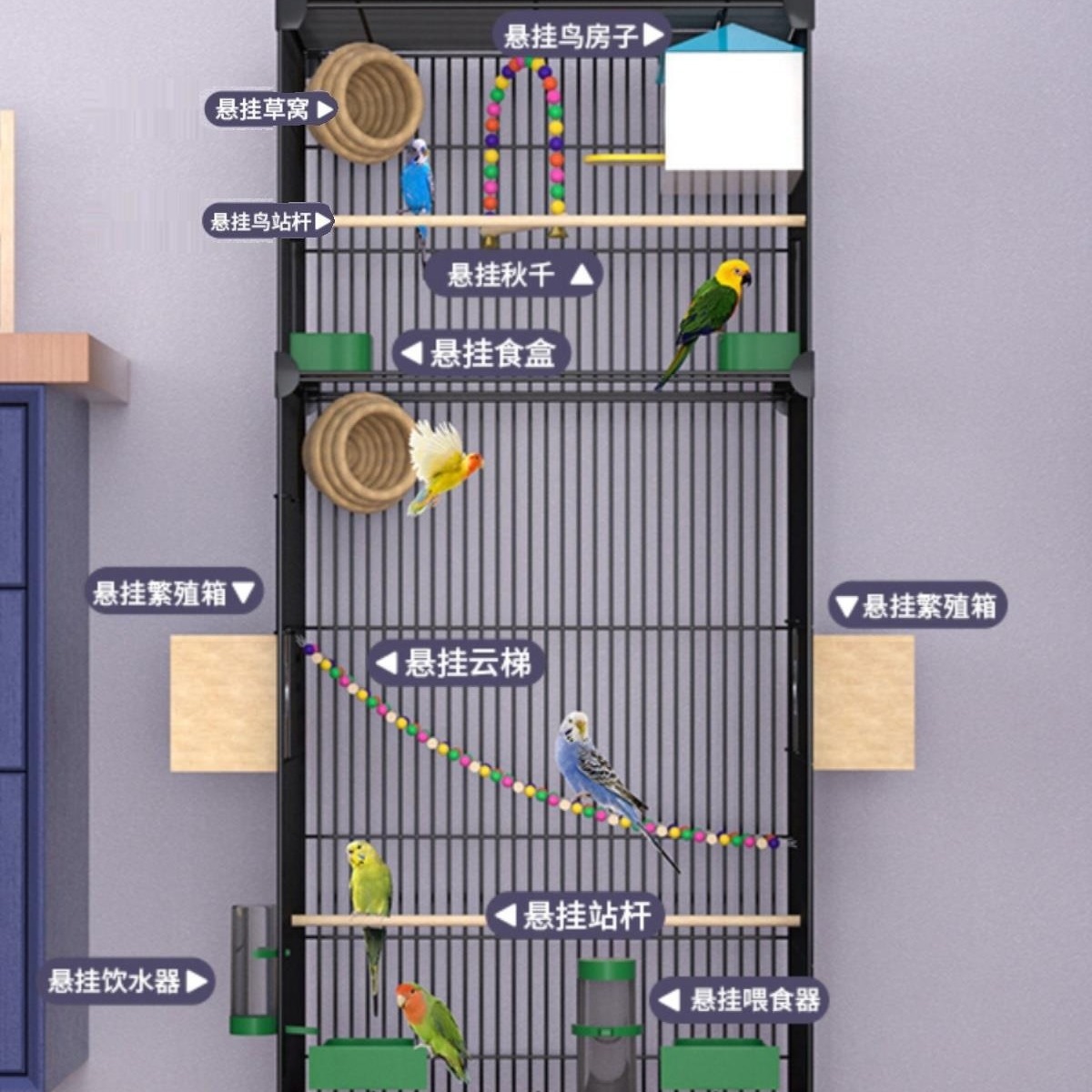Piliyang rumah lapisan ganda tipe Villa kandang burung empat warna logam kandang burung dalam ruangan menggantung burung kakak besar harimau kandang kulit