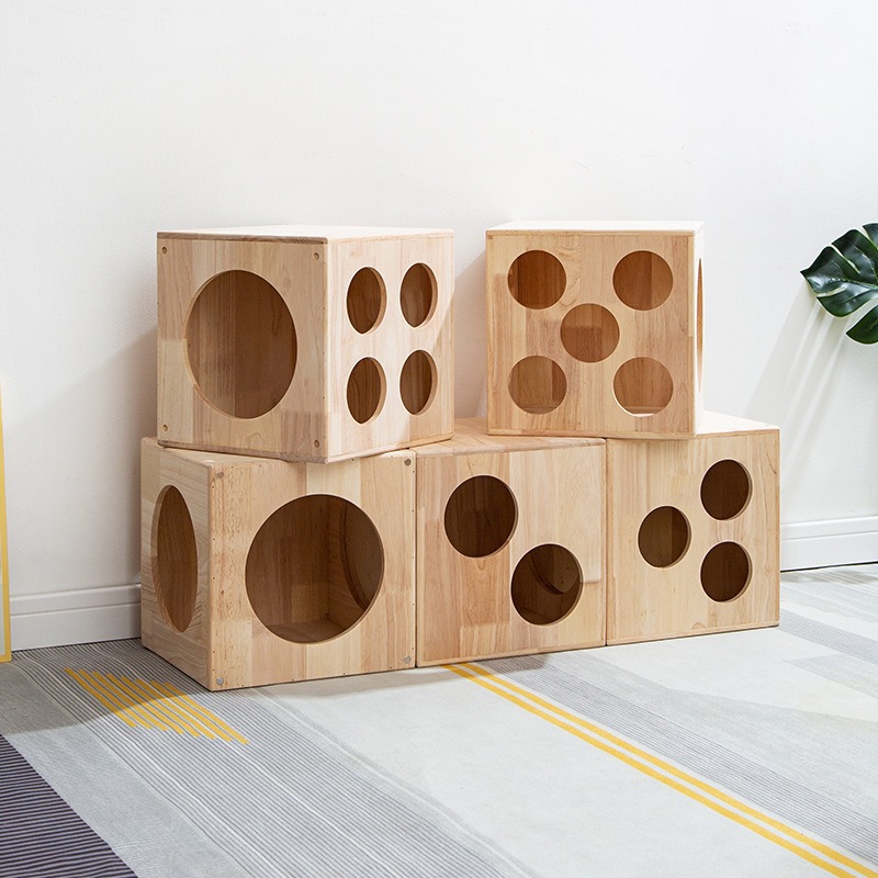 Sarang Kucing Villa Kreatif Kombinasi Dadu Kepribadian Kayu Solid Empat Musim Universal Terowongan Sarang Kucing Kayu Kuat dan Tahan Lama