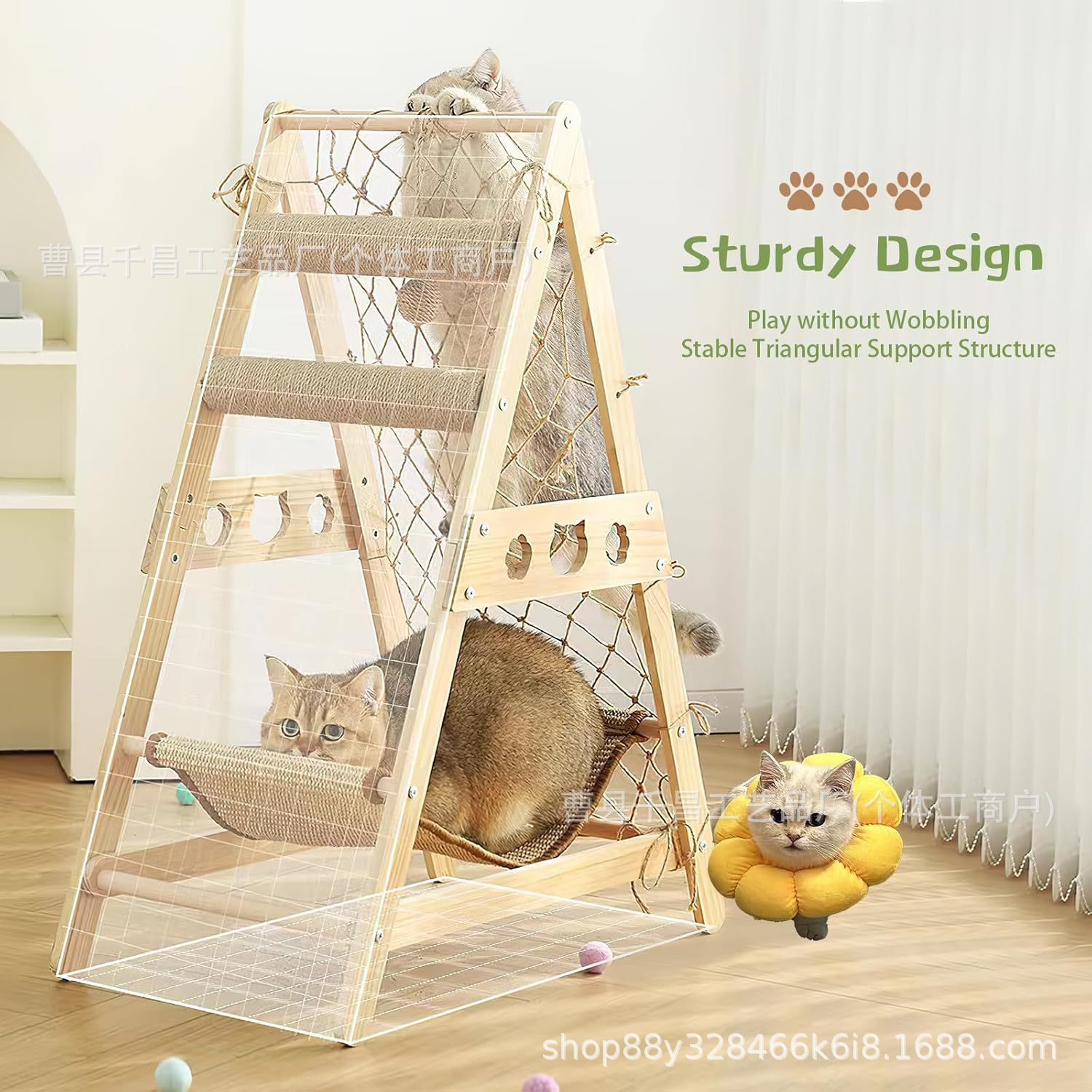 Rak gantung papan gores kucing, perlengkapan kucing sisal rangka pendakian pohon kucing terintegrasi kapsul ruang kayu padat melalui sarang kucing Tianzhu