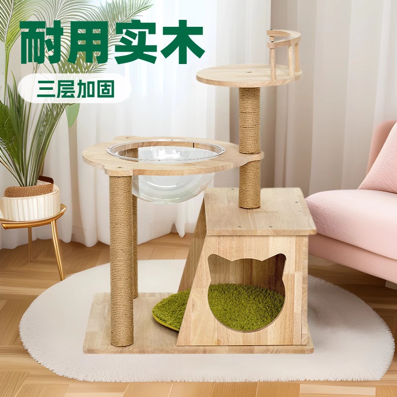 Rak gantung papan gores kucing, perlengkapan kucing sisal rangka pendakian pohon kucing terintegrasi kapsul ruang kayu padat melalui sarang kucing Tianzhu