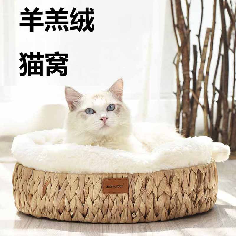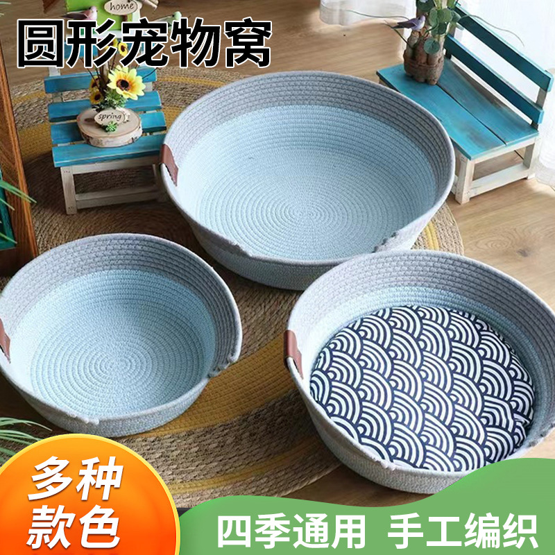 Sarang kucing rotan Universal empat musim Seleb online Jepang bantalan katun tenun bantalan tidur hewan peliharaan hangat tempat tidur kandang bulat dalam ruangan